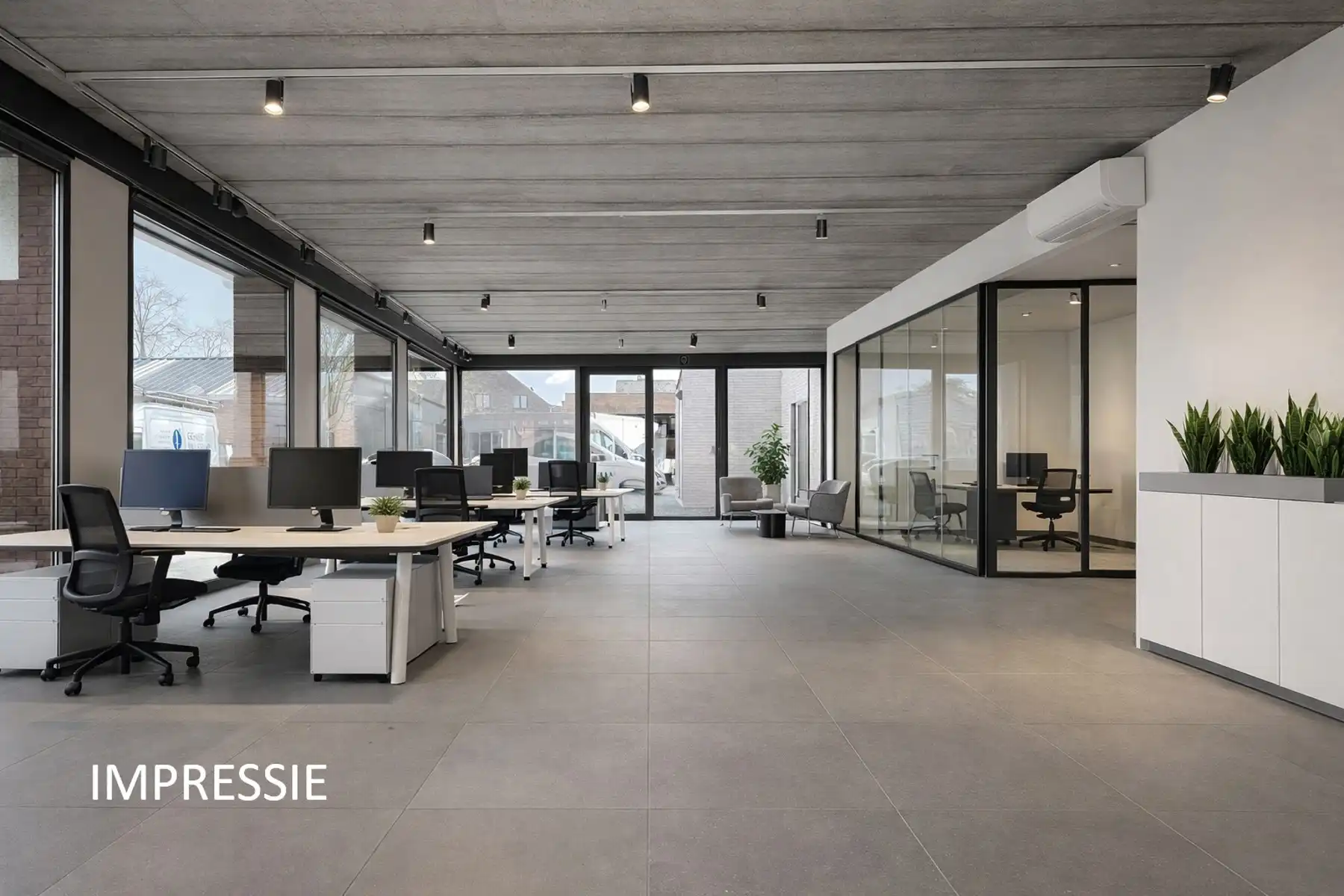 Bij het betreden van het kantoor komt u in een royale, open centrale ruimte die zich uitstekend leent voor een flexibele werkplek-indeling. Hierdoor is het pand uitermate geschikt voor diverse invullingen, variërend van een modern boekhoudkantoor, een praktijk voor vrije beroepen tot een stijlvolle showroom. Daarnaast beschikt het pand over een aparte ruimte die perfect kan dienen als directiebureel. Voor het nodige comfort is er een aparte, ingerichte kitchenette aanwezig, voorzien van opbergkasten, een spoelbak en een kookplaat met dampkap. Een apart toilet vervolledigt het gelijkvloers.